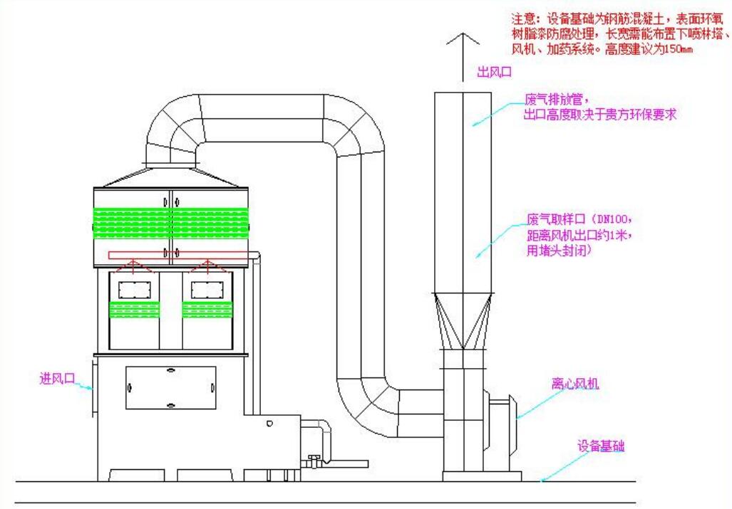 廢氣從(cong) 方形不鏽鋼噴淋塔塔體(ti) 下方進氣口進入噴淋塔,然後均勻地通過均流段上升到填料吸收段。在 填料的表麵上,氣相中物質與(yu) 液相中物質發生化學反應。塔體(ti) 的最上部是除霧段,氣體(ti) 中所夾帶的吸收液霧滴在這裏被清除下來,經過處理後的潔淨空氣從(cong) 噴淋塔上端排氣管 排放。吸收液在塔底經水泵增壓後在塔頂噴淋而下,最後回流至塔底循環使用。