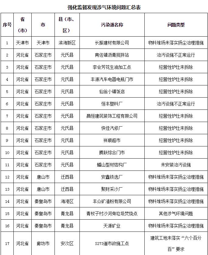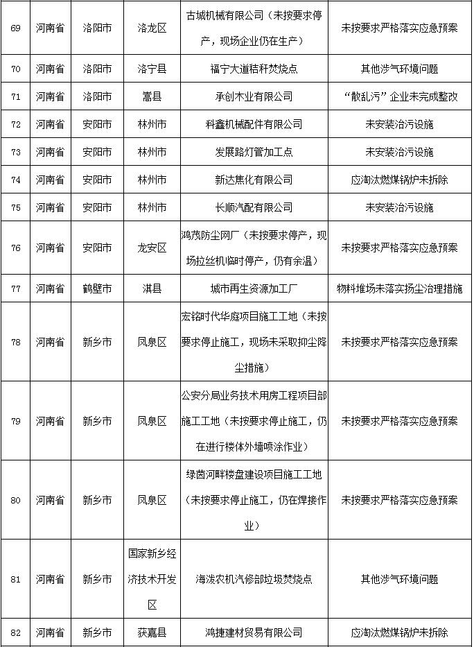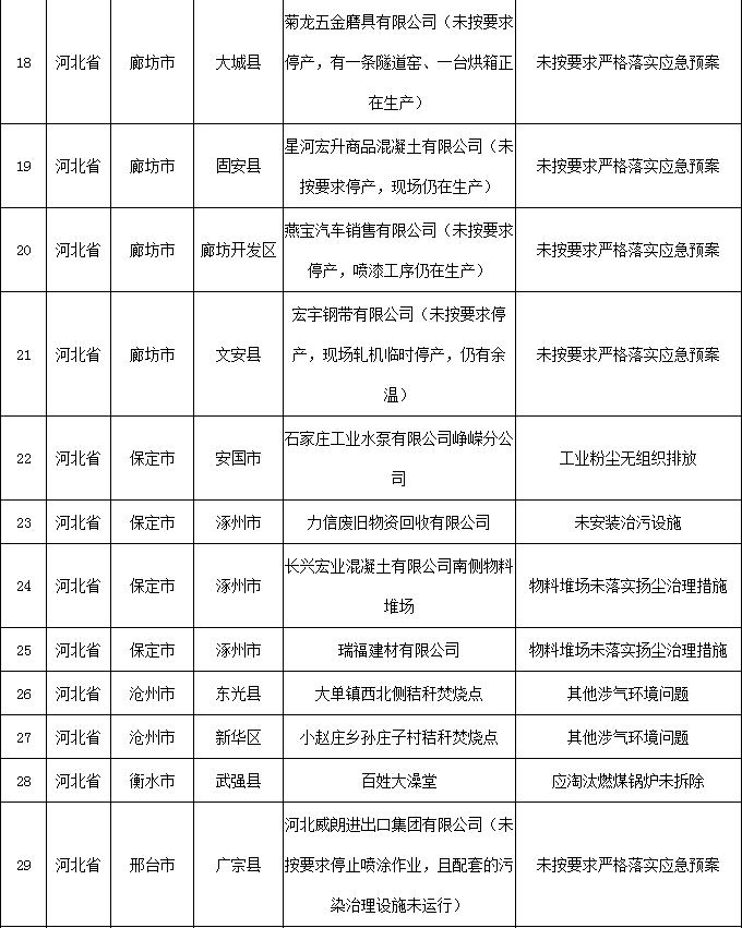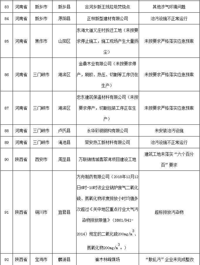2018-2019年藍天保衛戰重點區域強化監督工作繼續開展,12月13日工作組發現涉氣環境問題80個(ge) (其中1家企業(ye) 有2台應淘汰燃煤鍋爐,1家企業(ye) 有2台經營性爐灶),12月14日工作組發現未嚴(yan) 格執行重汙染天氣應急響應問題23個(ge) (見附表)。